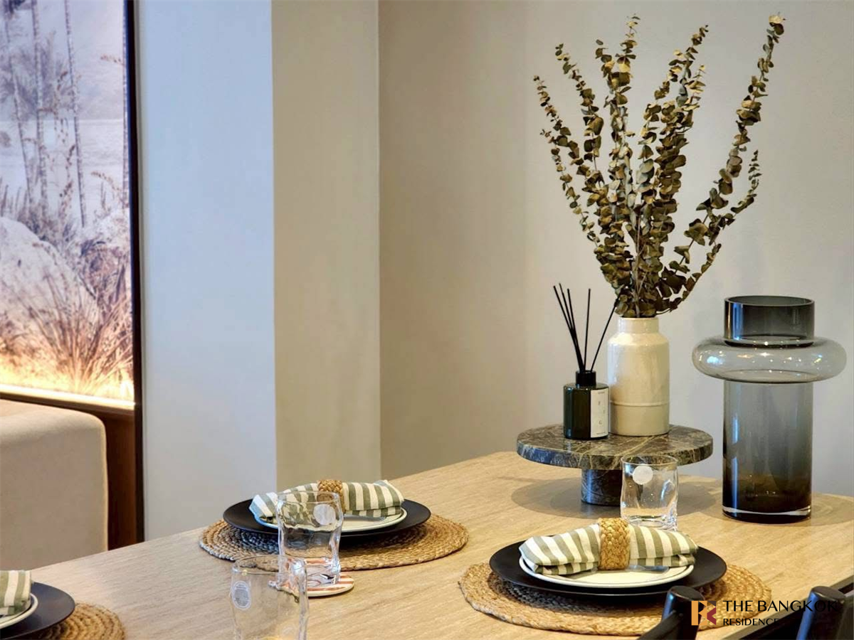 A beautifully styled condo featuring a warm Thai Tropical Modern atmosphere.