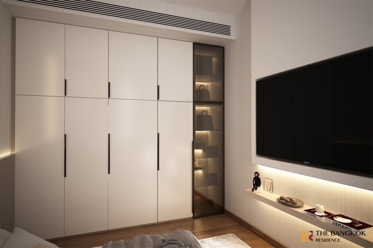 - 4 built-in rooms: living room with a bar, master bedroom (with bed, wardrobe, and dressing table), kitchen, and office.