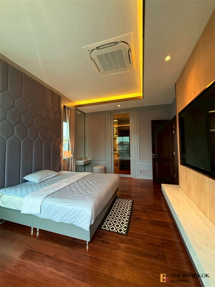 租金35万/月 售价4500万泰铢 完美杰作素坤逸 77 号酒店 近素万那普机场 7 分钟,Robinson Lat Krabang •房子朝北 周六房子前面没有灯光。 使用面积315平方米。 土地面积137平方米 - 卧室4 - 浴室6 - 客厅1 - 休息室1 - 厨房1 - 多功能室1(卧室4) - 女仆房1 - 停车位6(双车位)