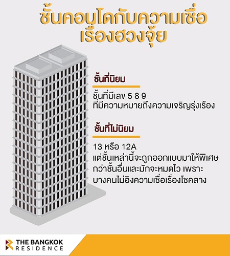 ปฎิเสธไม่ได้เลยนะคะว่าความเชื่อมักจะมีผลต่อการตัดสินใจ หลายๆคนก็มีทริคในการเลือกชั้นคอนโดมิเนียมตามหลักฮวงจุ้ย ยึดเลขมงคลเป็นหลัก โดยชั้นที่นิยมก็คือชั้นที่มีเลข 5 8 9 ที่มีความหมายถึงความเจริญรุ่งเรือง และหลีกเลี่ยงชั้นที่ 13 หรือ 12A แต่ในความเป็นจริงแล้วส่วนใหญ่ชั้น 13 หรือ 12A มักจะมีราคาดีและถูกออกแบบให้มีความพิเศษกว่าชั้นอื่น ห้องชั้นนี้มักจะหมดไวอีกด้วย